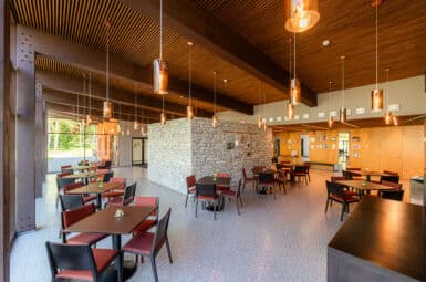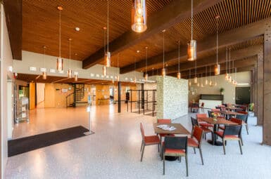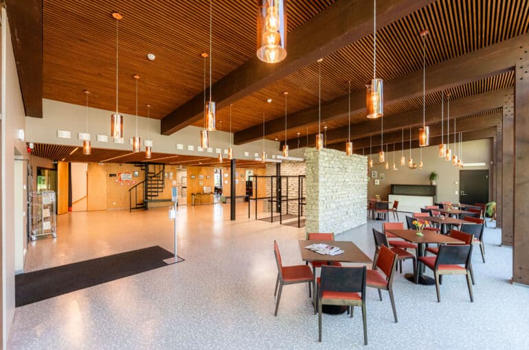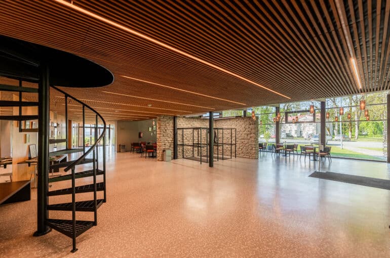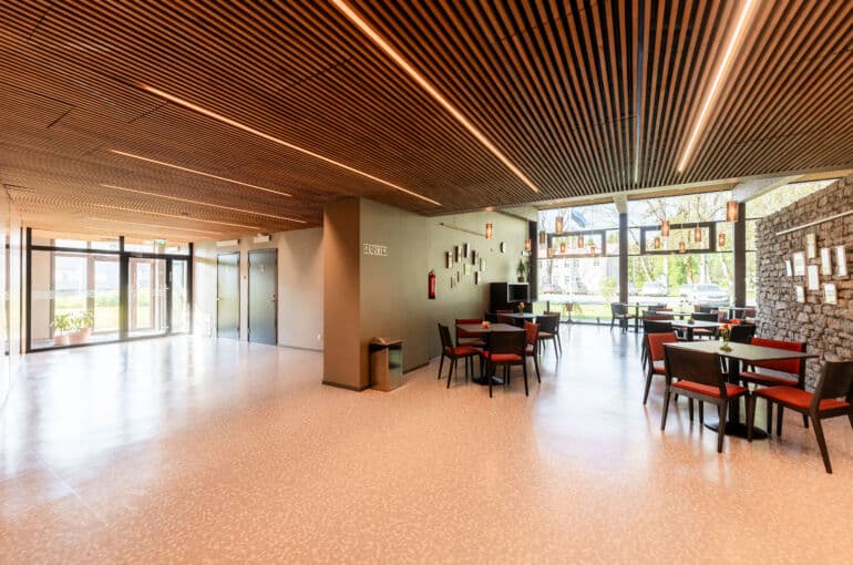 Vestibüülis on igapäevaselt olemas garderoob (stanged on ümbertõstetavad), 10 väikest lauda 40 tooliga, ratastel liigutatav lett.