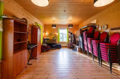 Mustjala rahvamajas on üks hubane kaminaruum, kus on väiksema seltskonnaga hea oma üritus teha. Ruumis on hubane valgus ja kamin elava tulega. Mahutab umbes 20 inimest laua taha istuma.